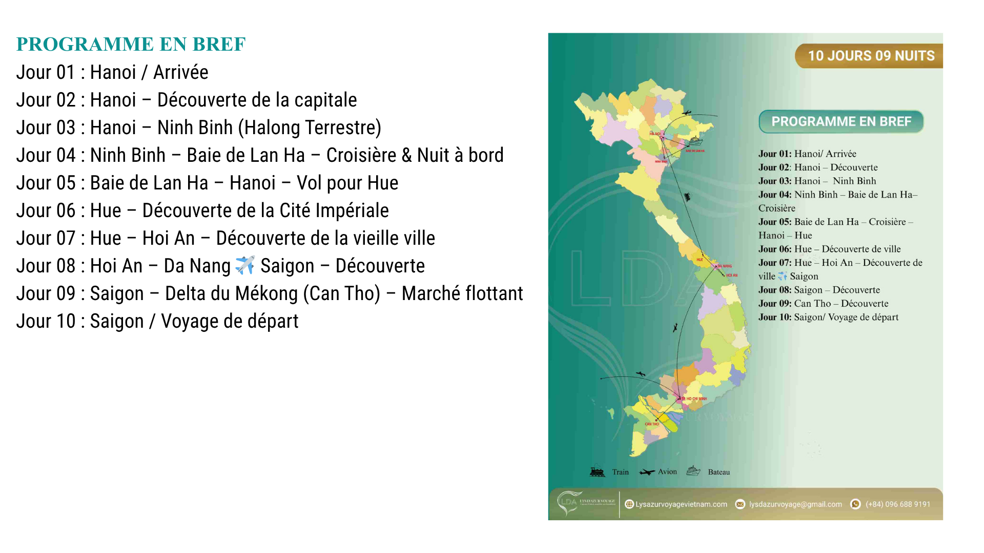 Entre découvertes culturelles, paysages grandioses et rencontres locales, chaque étape dévoile une facette unique du Vietnam. Plus qu’un simple itinéraire, c’est une véritable traversée du pays et de ses émotions, condensée en 10 jours d’expériences inoubliables