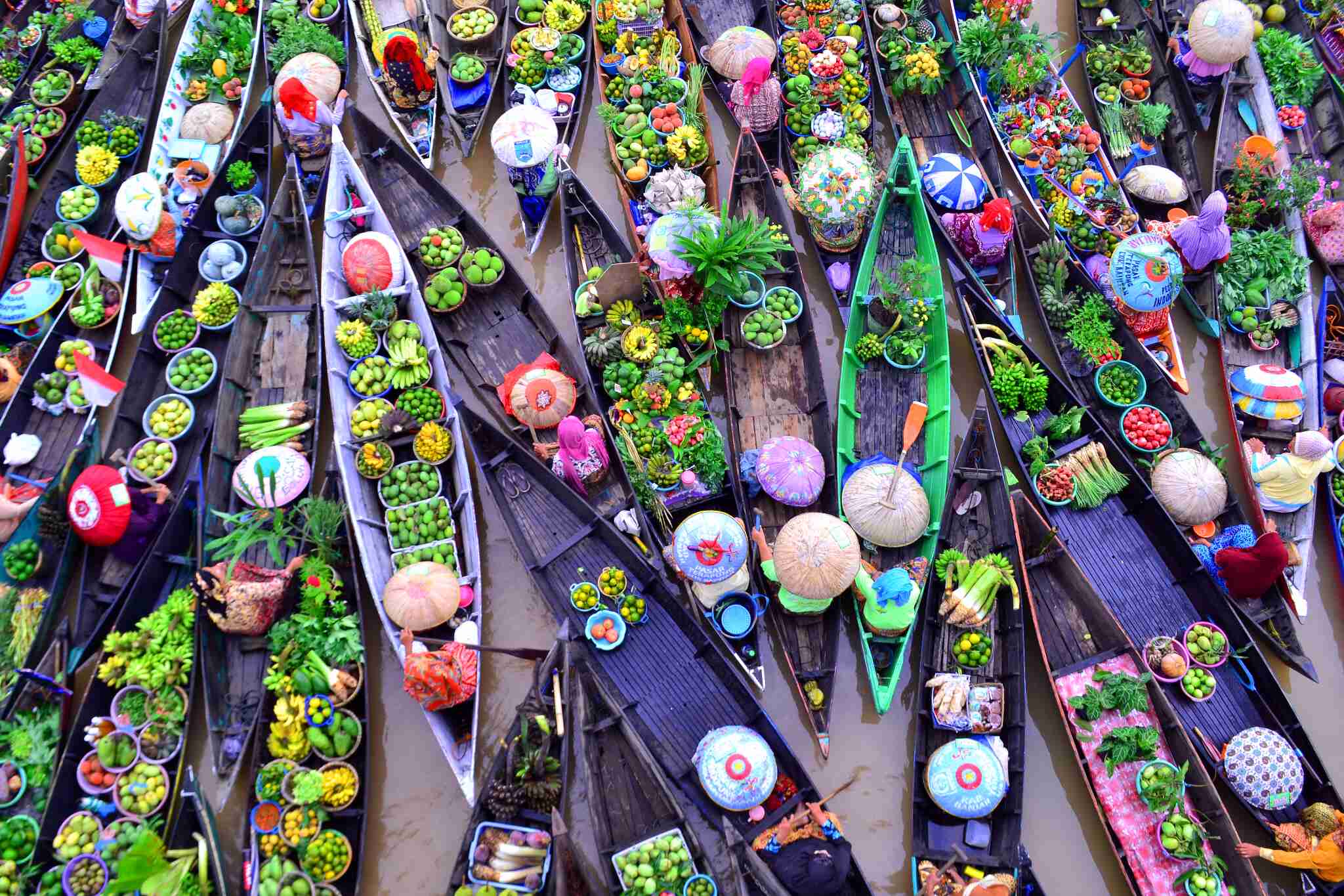 Vous découvrirez la vie commerçante sur l’eau, où les vendeurs locaux proposent leurs fruits et légumes frais directement depuis leurs bateaux.