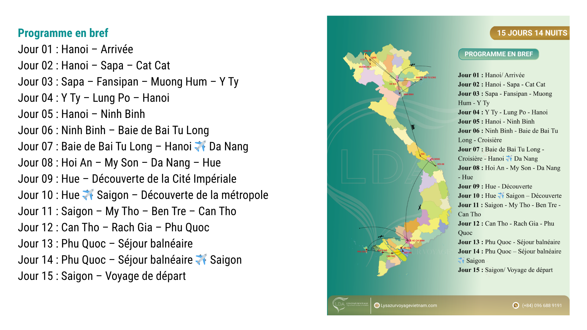 Ce circuit de 15 jours, "Le Vietnam des Cimes à l’Île de Perle", est une invitation à une épopée sensorielle unique, entre montagnes sacrées, baies mystiques et plages paradisiaques. Conçu pour les voyageurs en quête d'essentiel et de diversité, ce périple offre un condensé magistral des beautés du Vietnam, du sommet du Fansipan aux eaux turquoise du Golfe de Thaïlande.