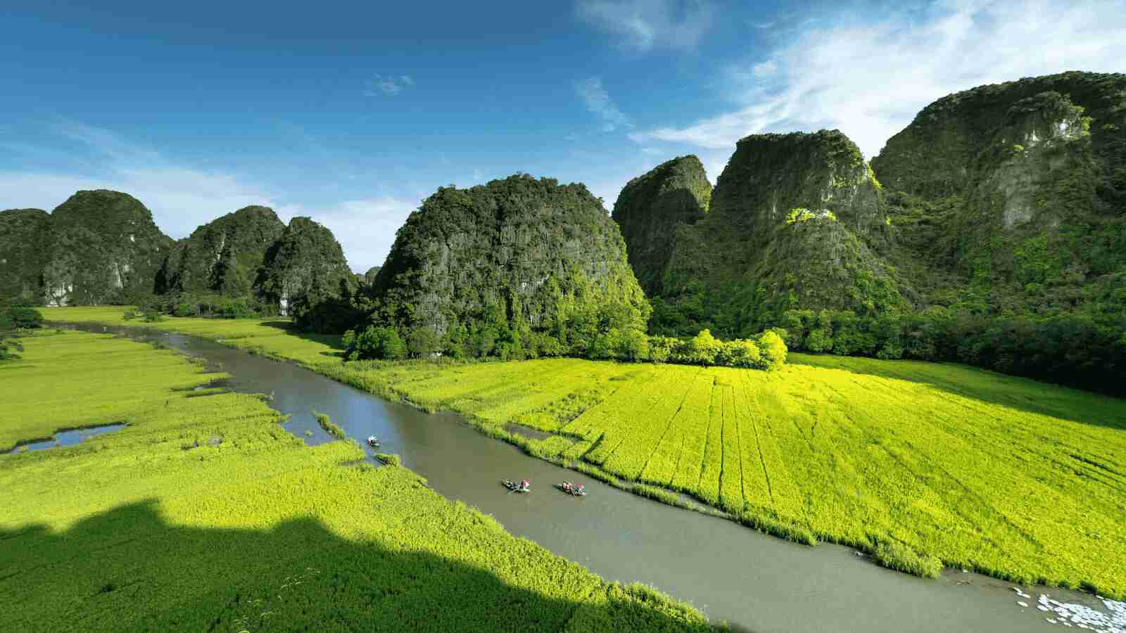 Dans l'après-midi, une aventure à vélo vous attend. Vous pédalerez tranquillement à travers les rizières qui serpentent au milieu des vallées et des majestueuses montagnes karstiques, une région souvent surnommée la "Baie d'Ha Long terrestre" en raison de ses formations rocheuses similaires.