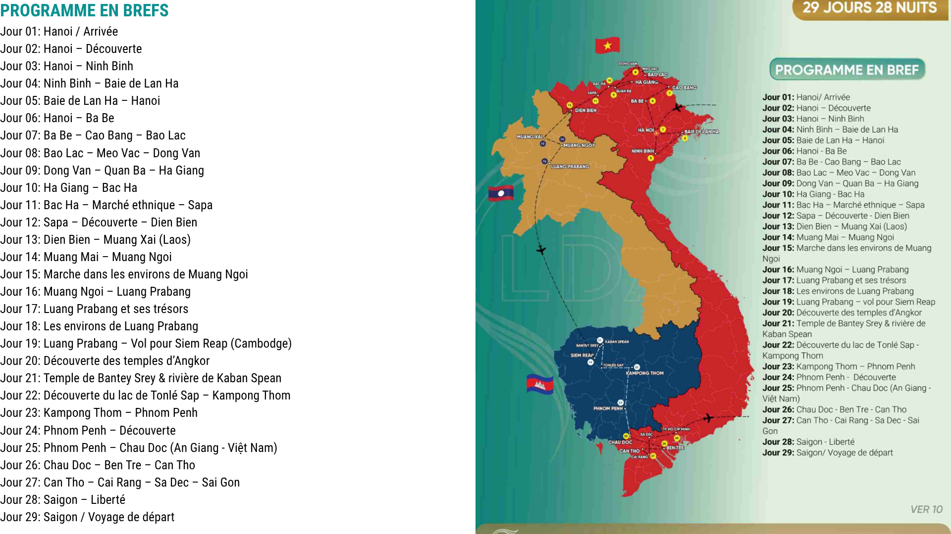 Hanoi – Ninh Binh – Baie de Lan Ha – Ba Be – Ha Giang – Sapa – Dien Bien – Muang Ngoi (Laos) – Luang Prabang – Angkor (Cambodge) – Phnom Penh – Delta du Mékong – Saigon