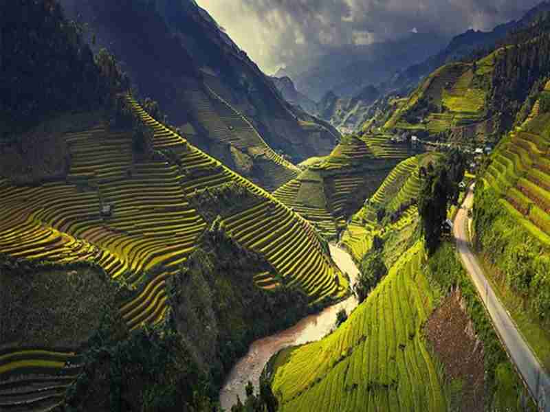 Ensuite, une fois à Meo Vac, vous vous lancerez dans la traversée du majestueux col de Ma Pi Leng, l'un des quatre plus grands cols du Vietnam. Son nom, qui signifie "le nez du cheval" en langue locale, est un prélude à un panorama "paradisiaque" à couper le souffle. Le long de cette route vertigineuse, vous serez émerveillé par la succession de montagnes calcaires, abruptes et majestueuses, qui forment une muraille naturelle inébranlable. Au fond, la rivière Nho Que serpente tel un ruban de soie d'un bleu profond, se faufilant entre les rizières en terrasses et les villages Hmongs perchés au sommet des montagnes.